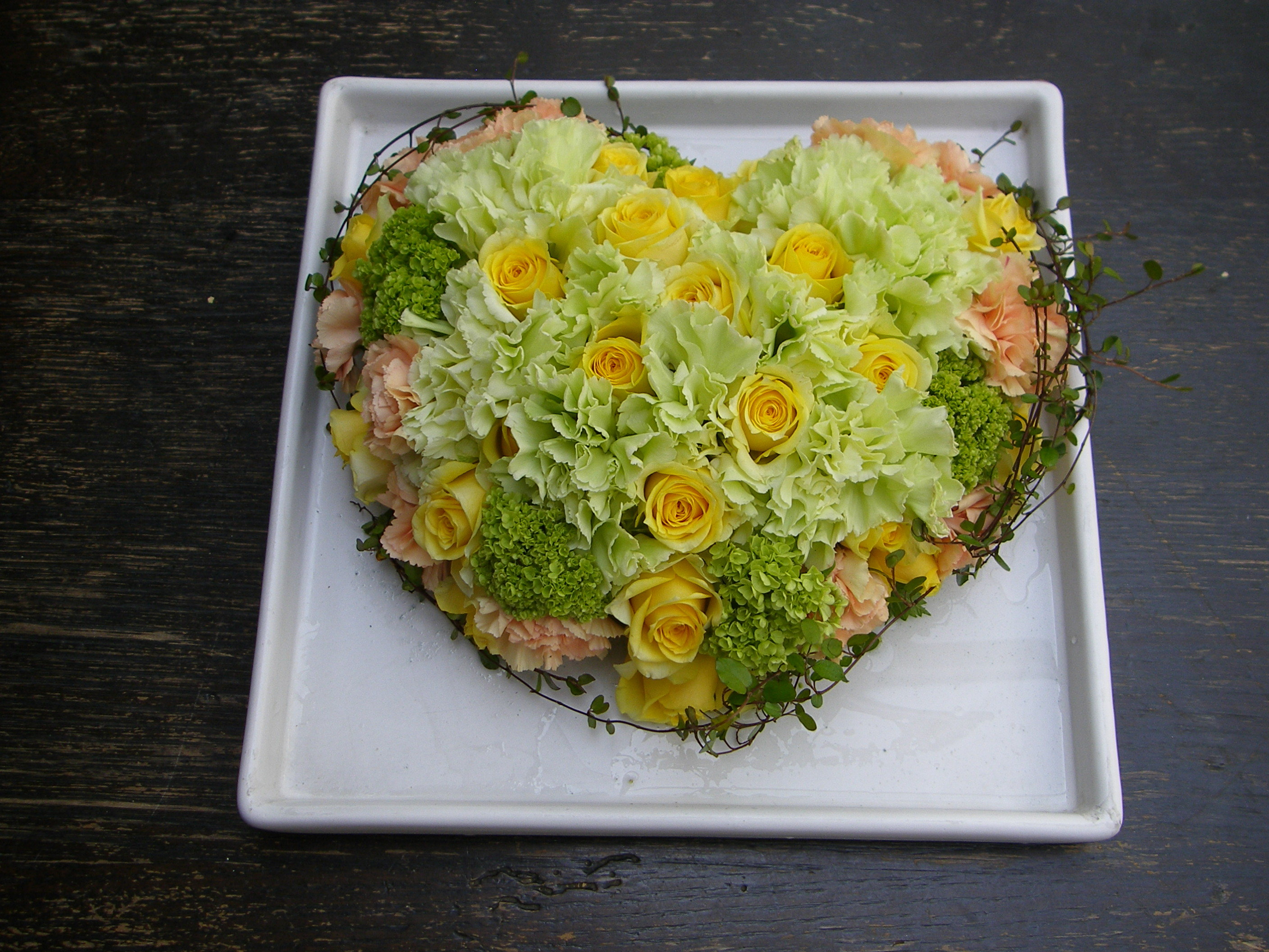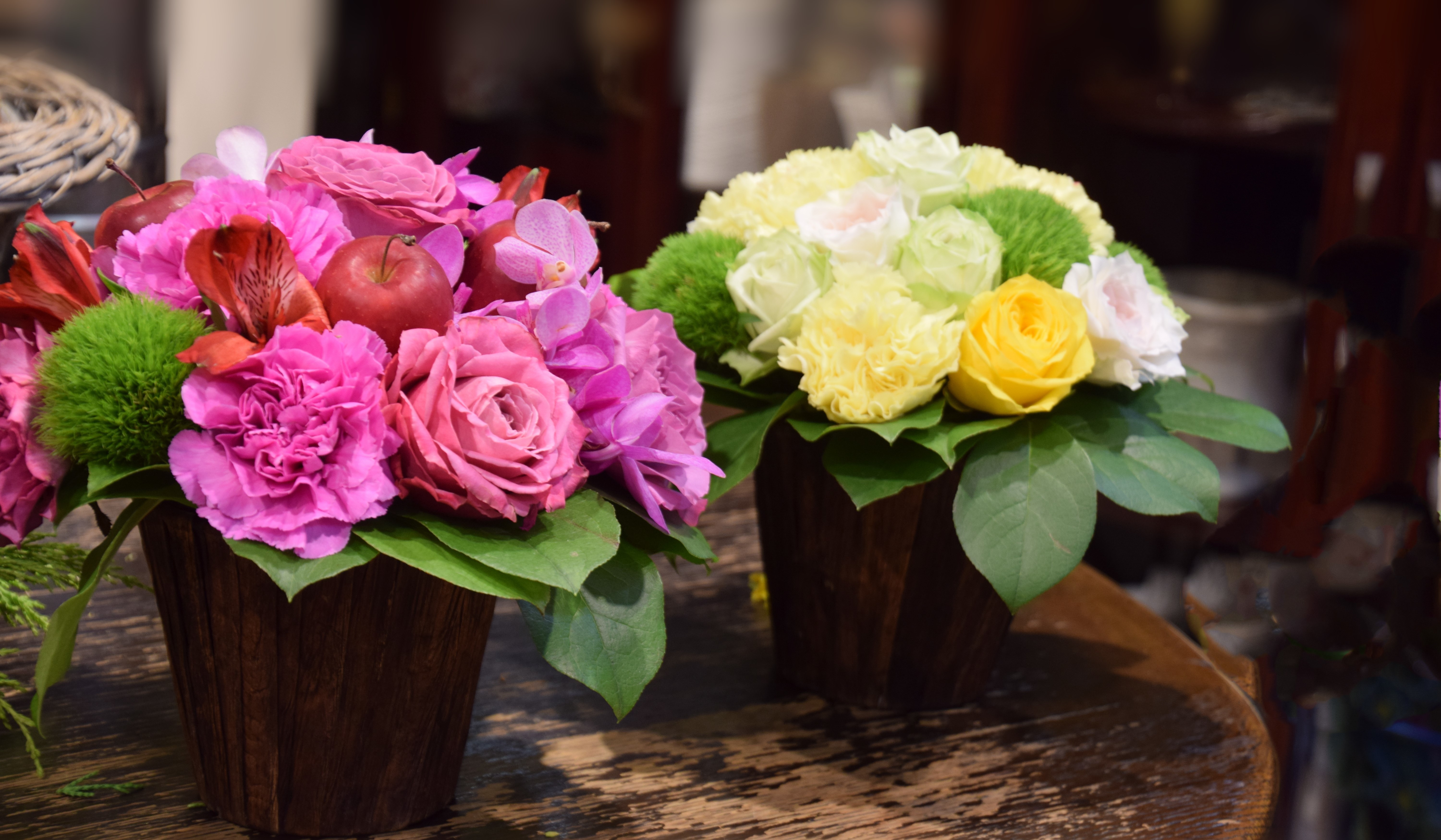 アレンジメントとは、オリジナルの器にお花をアレンジしたものです、器の中にお花のスポンジに水を含ませてあるのでそのまま飾れるアレンジメントです。